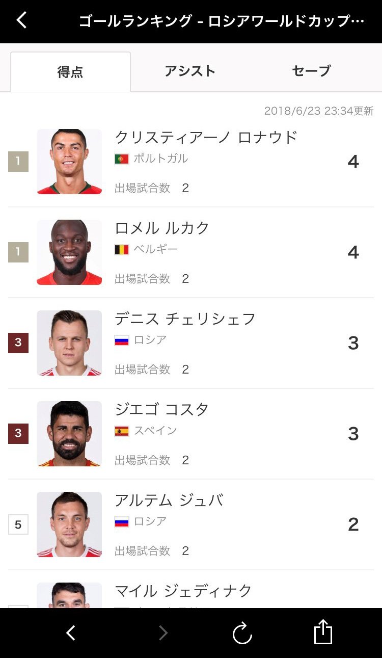 スポーツナビ サッカー編集部 W杯 得点ランキング チュニジア戦で2ゴールを挙げたベルギーのルカクが4得点でc ロナウドに並びました どこまで記録が伸びるか楽しみです ランキングはこちら T Co L7zuqyn7mn ワールドカップ